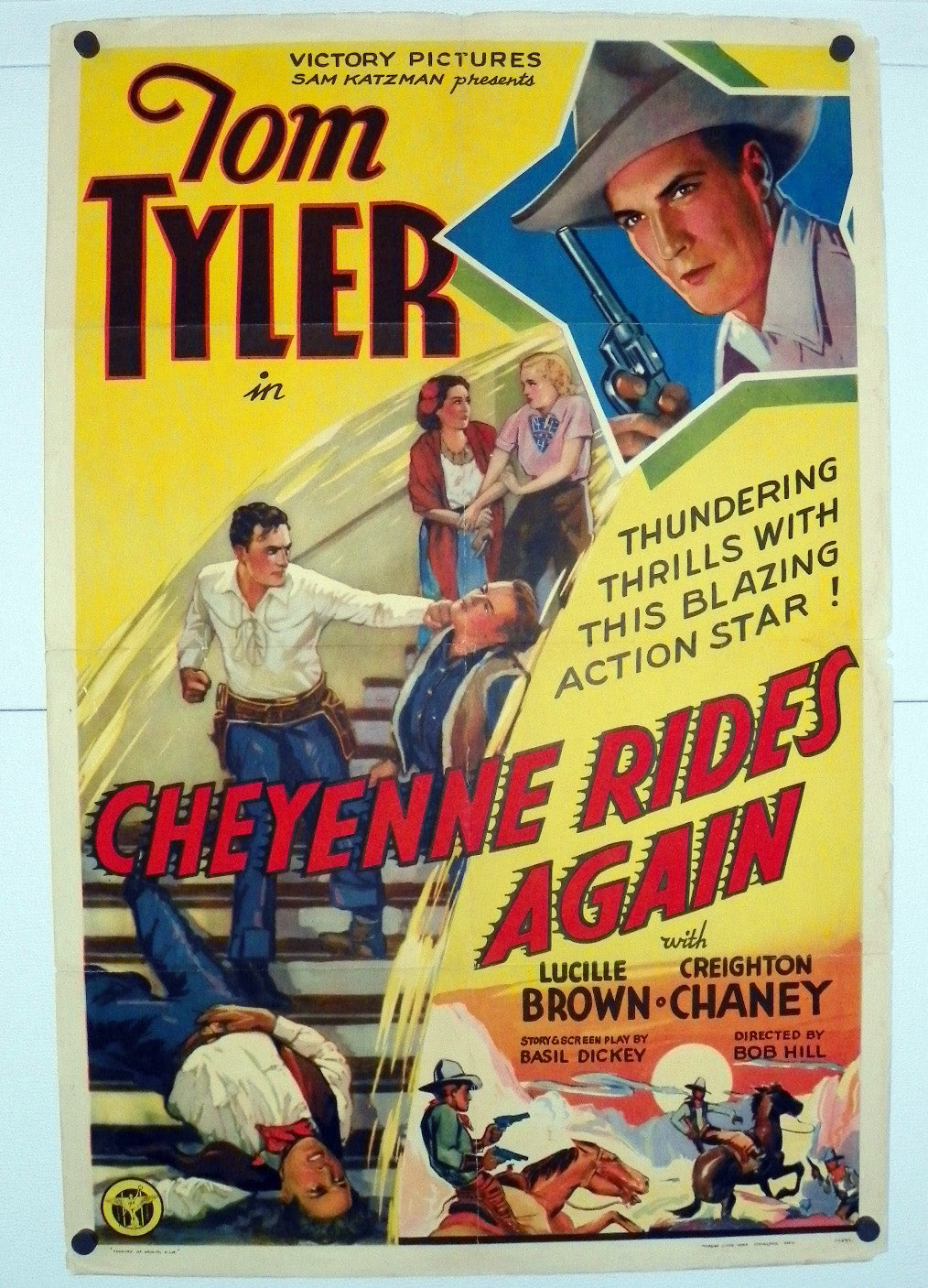 Thundering thrills with this blazing action star!Condition: Good - With fold separation (taped on the reverse and touched up with a colored pencil on the center fold, so the white tape on the reverse isn't as noticeable), border tears (especially on the upper and right sides, as well as some corner paper loss.