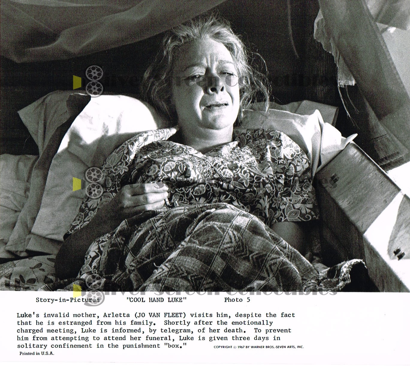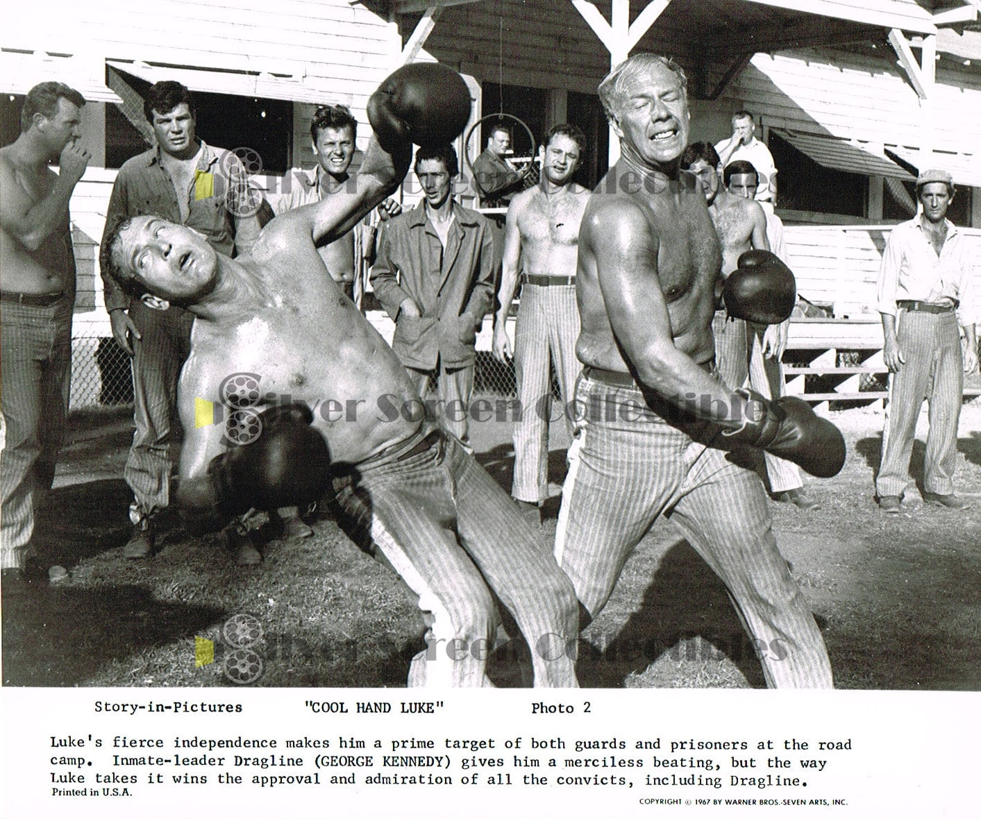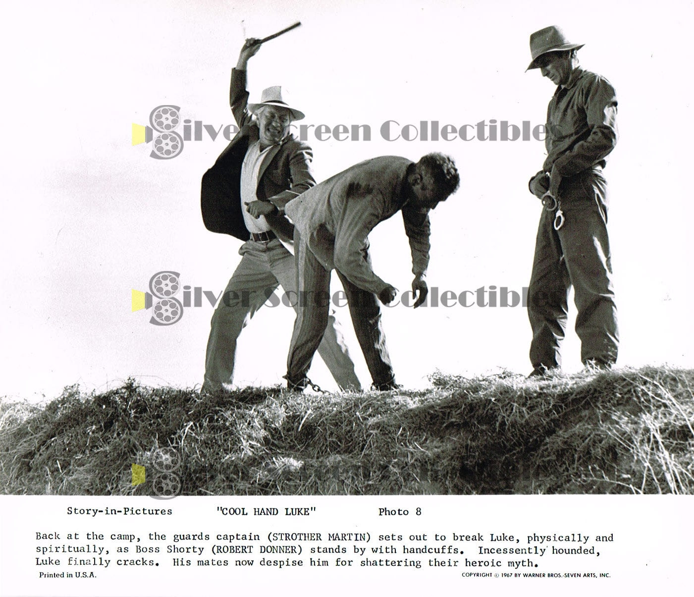Cool Hand Luke - Story In Pictures. The is a 9 photo set accompanied by a two-page Warner Bros publicity story outline. Seven of the pics feature Paul Newman, one of Jo Van Fleet and one of an incredibly sexy Joy Harmon (listed as "a roadside sexpot"). Seven of the photos measure 8" x 9.5" and two (both "portrait") measure 7.5" x 9.5" (they are original size, and have not been trimmed). We are including a 10th photo (Paul holding a cane) not part of the 9 pic set as a bonus!