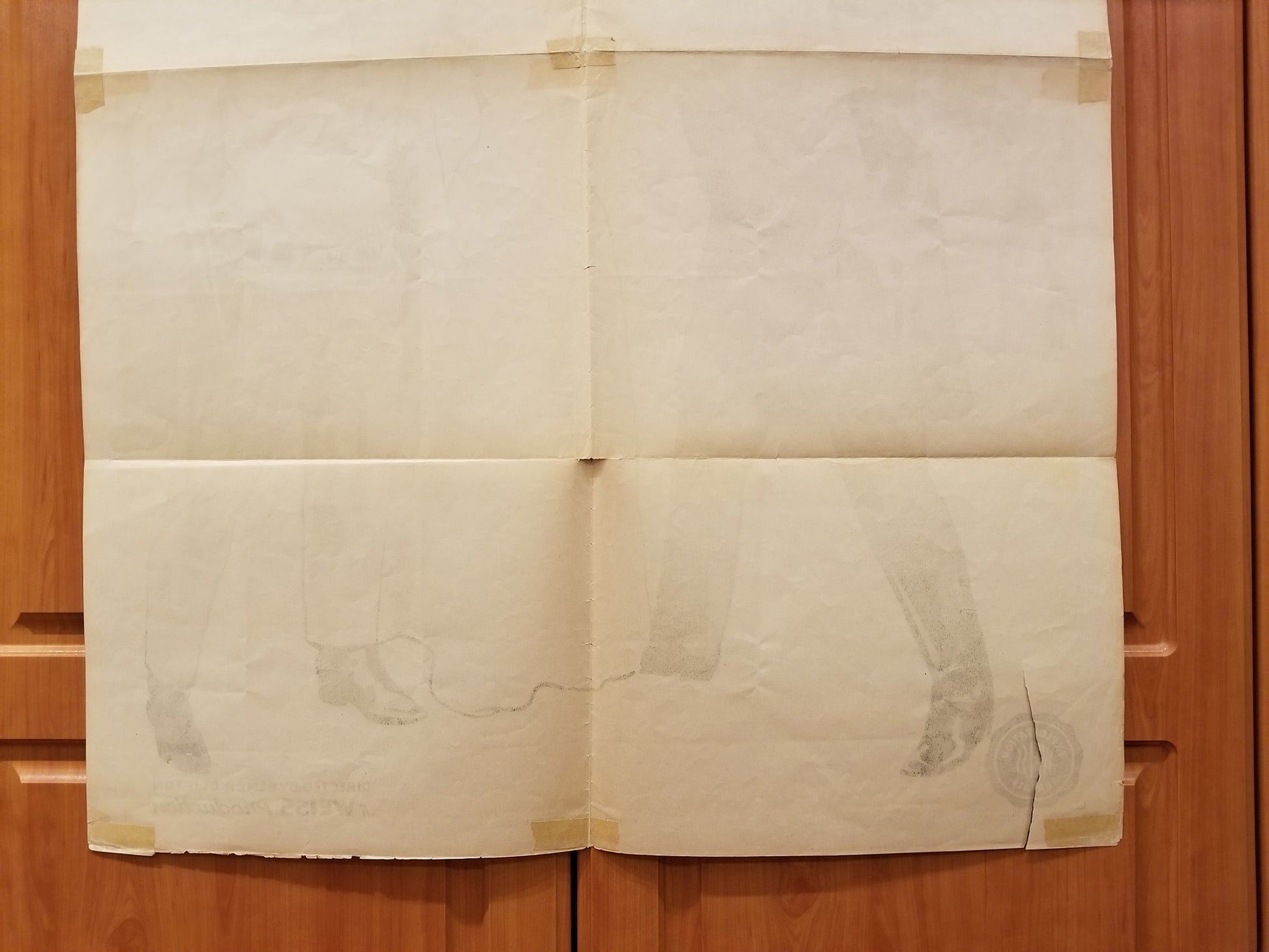Condition: Fair to Good - With great bright colors, and several tears (including a several inch one in the lower left corner), tape stains, fold separations and wear, a few small holes, along with a rough/tattered lower edge. The reverse has several pieces of tape on it.
