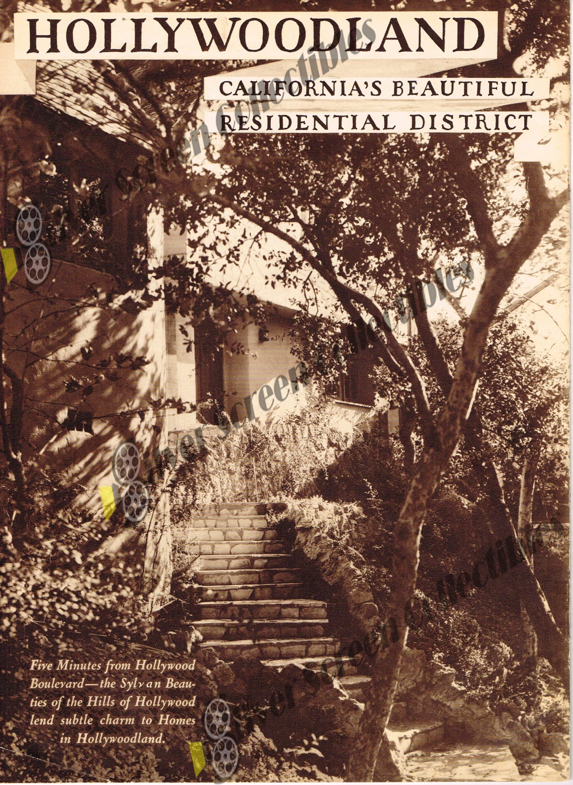 "A pictorial record of actual photographs taken in this distinctive homeplace". "Five minutes from Hollywood Boulevard - the sylvan beauties of the hills of Hollywood lend subtle charm to homes in Hollywoodland". An amazing piece of Hollywood history! This 16-page (inclusive of covers) sepia-toned publication features over 80 vintage photos of the original Hollywoodland neighborhood development. This is basically a promotional brochure encouraging people to invest in homes in this prestigious area. There are great images of the architecture, landscaping, scenery and skyline of the area. The Hollywoodland project was the brainchild of Community Developer S.H. Woodruff, with the cooperation of Harry Chandler and M. H. Sherman.Condition: Very Good to Fine - With subtle water staining on the bottom of each page (visible in the included images), expected wear, as well as a corner crease on the back cover. The staples are intact.