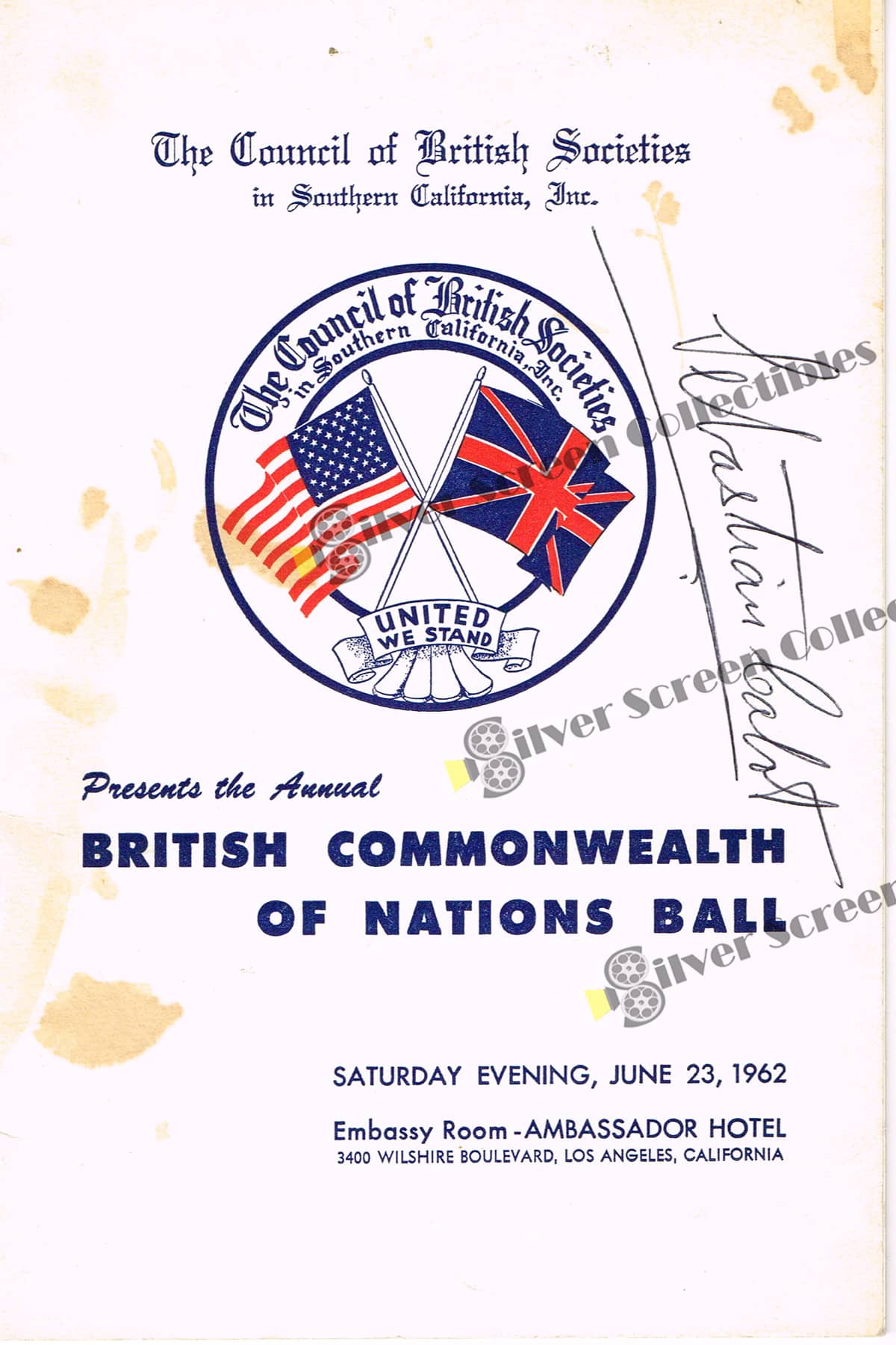 This is a rare program from the June 1962 British Commonwealth of Nations Ball, signed by Mr. French himself, Sebastian Cabot. The signature has been JSA certified. Note: The image of a smiling Sebastian Cabot as well as the Family Affair cast image are included for display purposes only and are NOT included in this sale.Condition: Very Good to Fine - With stains on the cover.