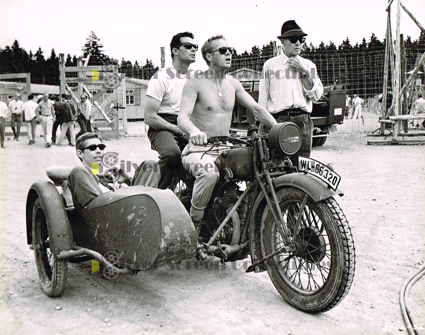 The Great Escape (1963) / Steve McQueen on a motorcycle with James Coburn & James Garner Vintage B&W Movie Still/Photo (8" x 10")