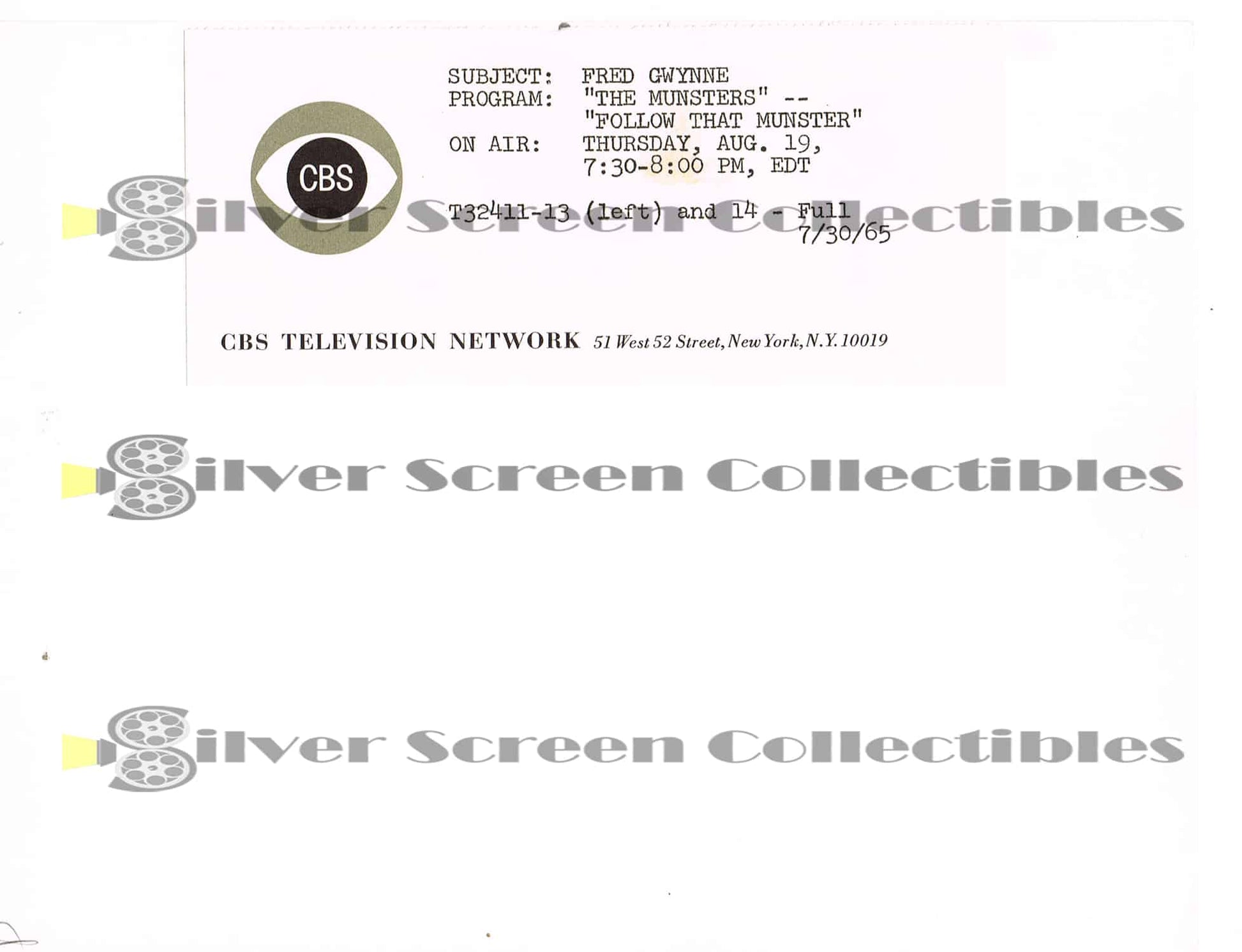 A family of friendly monsters that have misadventures all while never quite understanding why people react to them so strangely. A great dual portrait of Herman (Fred Gwynne) in disguises for the episode "Follow That Munster". There is a studio "snipe" attached to the reverse.Condition: Very Fine - With only one side of the perforated snipe attached.